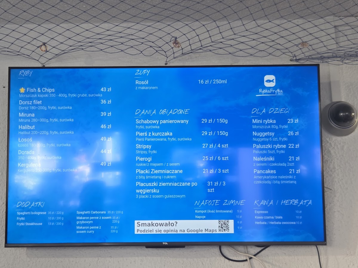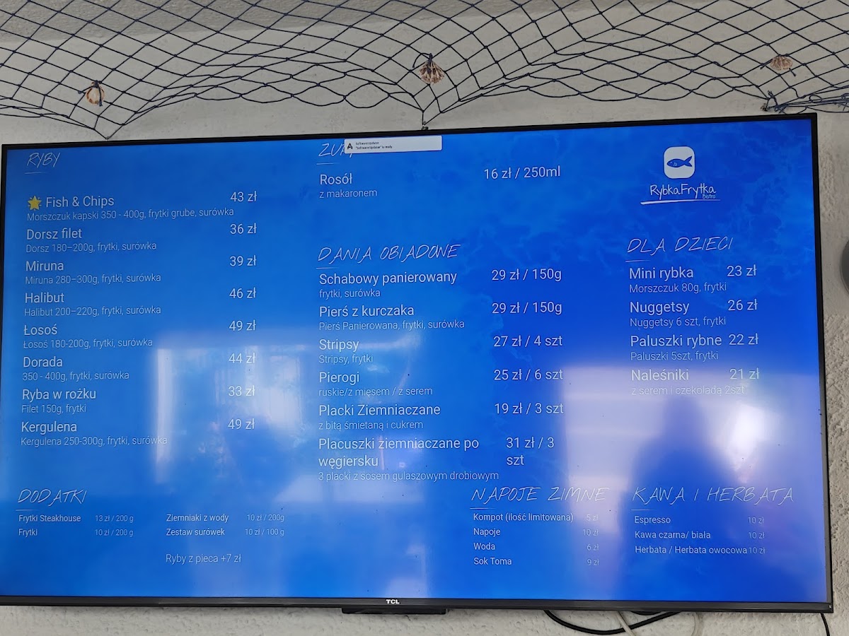 From a reviewer's perspective, Rybka Frytka at Wojska Polskiego 5 in Mielno offers a menu that skillfully balances classic Polish comfort foods with fresh seafood options. The fish selection shines with items like Fish & Chips, Dorsz filet, Miruna, Łosoś Pieczony, and Halibut, giving seafood lovers a variety of flavorful choices. For heartier meals, the Danie Obiadowe section features Schabowy Panierowany, Pierś z kurczaka, and Stripsy, alongside traditional Polish staples like Pierogi-available with ruskie, meat, cheese, or strawberry fillings-and Placki ziemniaczane, offering something for every palate. Families with children will appreciate options such as Mini rybka, Nuggetsy, Paluszki Rybne, and sweet or savory Naleśniki, ensuring little diners are also catered to. The daily-changing zupa keeps the menu fresh and surprising, while the beverage list is equally inviting, with Żywiec (Z NALEWAKA), Żywiec Białe (Z NALEWAKA), a selection of craft beers, white and red wines, and even Prosecco for a sparkling touch. Overall, the menu at Rybka Frytka combines variety, tradition, and approachable pricing, making it a compelling choice for anyone seeking a relaxed, flavorful dining experience in Mielno.